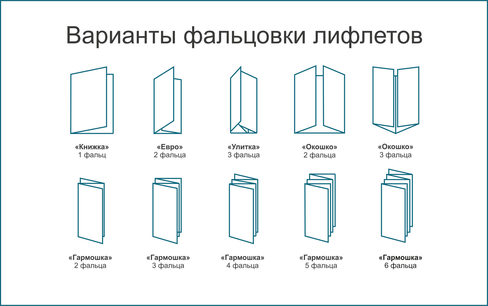 Основное отличие от брошюры — отсутствие скрепляющих элементов. Двухсторонний отпечатанный лист складывается несколько раз: дельтообразно, гармошкой или другим способом. Количество фальцев — сгибов, от 2-х и более. Технология печати: цифровая или офсетная — зависит от тиража. В условиях изготовления лифлета используется мелованная бумага. Плотность: 115—300 г/м².